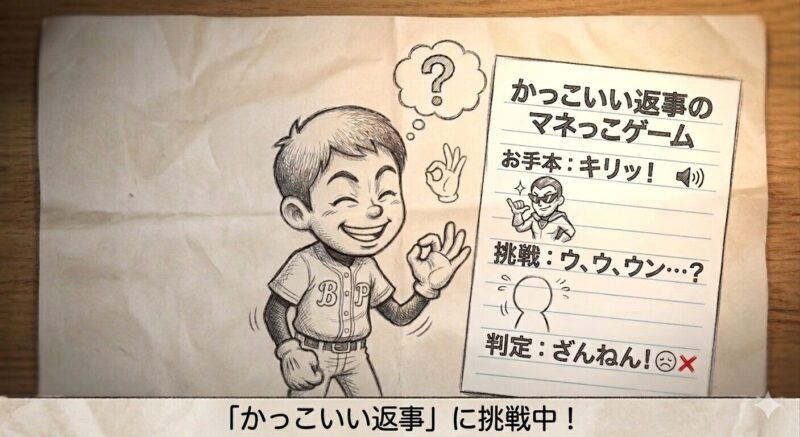 「今日、グラウンドで一番かっこいい返事をしてたのは誰? ちょっとマネしてみてよ」と、