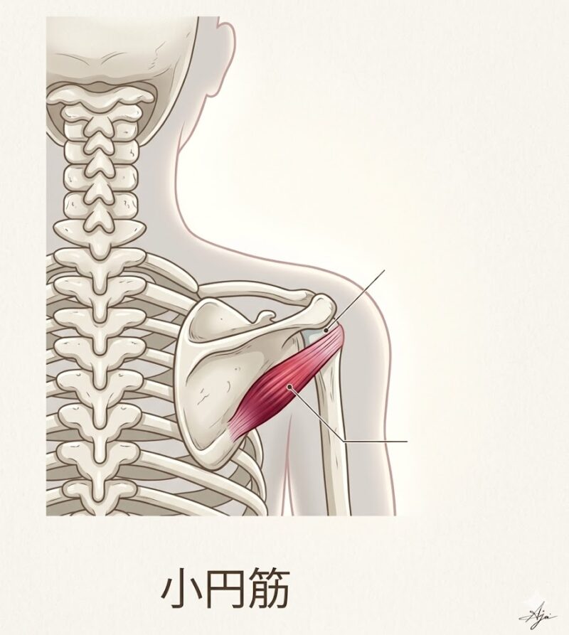 3.小円筋(しょうえんきん):肩の後ろ側をガードする。
