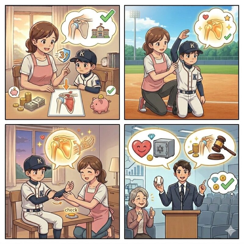 ※1 FP(ファイナンシャルプランナー):顧客の資産状況に基づき、教育・老後などの資金計画を立てるお金の専門家。ここでは「野球を一つの資産運用」と捉える視点を提供します。 ※2 内部監査:組織の業務がルール通り適正に行われているか、内部の人間が自らチェックすること。ここでは親が子の体の状態を客観的に確認することを指します。